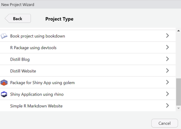 βββ test-main.Rapp/main.R - Application entry pointapp/logic/ - Business logic (Shiny-independent)app/view/ - UI components and modulesapp/static/ - static like picsapp/styles/ - CSS filesCreate your rhino app with the New Project feature with R studio.